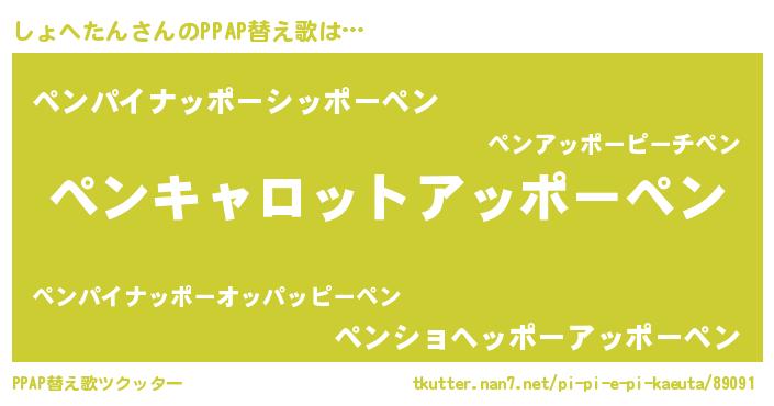 しょへたんさんのPPAP替え歌は… 『ペンキャロットアッポーペン』『ペンパイナッポーシッポーペン』『ペンショヘッポーアッポーペン』 ツクッター #PPAP替え歌ツクッター http://tkutter.nan7.net/pi-pi-e-pi-kaeuta/89091/