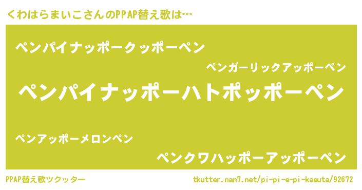 | 男性向けラノベタイトル風あだ名 | 『くわはらまいこ~年齢イコール彼女いない歴の魔法使い~』 |