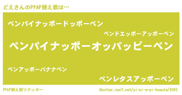 どえさんのPPAP替え歌は… 『ペンパイナッポーオッパッピーペン』『ペンパイナッポードッポーペン』『ペンレタスアッポーペン』 ツクッター #PPAP替え歌ツクッター http://tkutter.nan7.net/pi-pi-e-pi-kaeuta/9302/