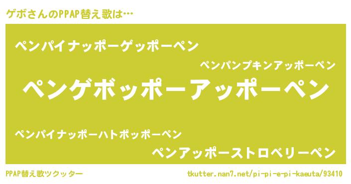 ゲボさんのPPAP替え歌は… 『ペンゲボッポーアッポーペン』『ペンパイナッポーゲッポーペン』『ペンアッポーストロベリーペン』 ツクッター #PPAP替え歌ツクッター http://tkutter.nan7.net/pi-pi-e-pi-kaeuta/93410/