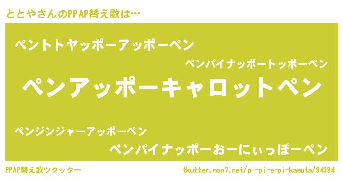ととやさんのPPAP替え歌は… 『ペンアッポーキャロットペン』『ペントトヤッポーアッポーペン』『ペンパイナッポーおーにぃっぽーペン』 ツクッター #PPAP替え歌ツクッター http://tkutter.nan7.net/pi-pi-e-pi-kaeuta/94394/