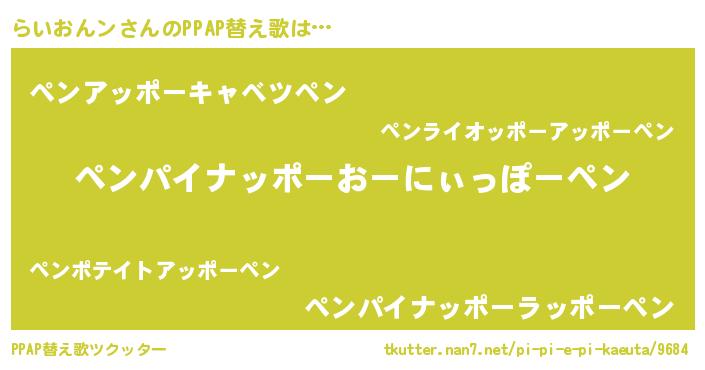 らいおんンさんのPPAP替え歌は… 『ペンパイナッポーおーにぃっぽーペン』『ペンアッポーキャベツペン』『ペンパイナッポーラッポーペン』 ツクッター #PPAP替え歌ツクッター http://tkutter.nan7.net/pi-pi-e-pi-kaeuta/9684/