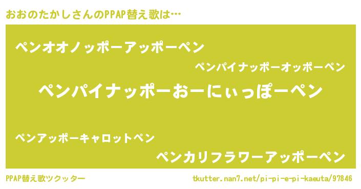 おおのたかしさんのPPAP替え歌は… 『ペンパイナッポーおーにぃっぽーペン』『ペンオオノッポーアッポーペン』『ペンカリフラワーアッポーペン』 ツクッター #PPAP替え歌ツクッター http://tkutter.nan7.net/pi-pi-e-pi-kaeuta/97846/