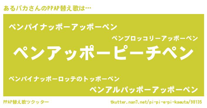 あるパカさんのPPAP替え歌は… 『ペンアッポーピーチペン』『ペンパイナッポーアッポーペン』『ペンアルパッポーアッポーペン』 ツクッター #PPAP替え歌ツクッター http://tkutter.nan7.net/pi-pi-e-pi-kaeuta/98135/