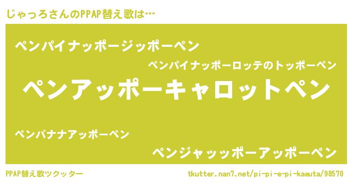じゃっろさんのPPAP替え歌は… 『ペンアッポーキャロットペン』『ペンパイナッポージッポーペン』『ペンジャッッポーアッポーペン』 ツクッター #PPAP替え歌ツクッター http://tkutter.nan7.net/pi-pi-e-pi-kaeuta/98570/