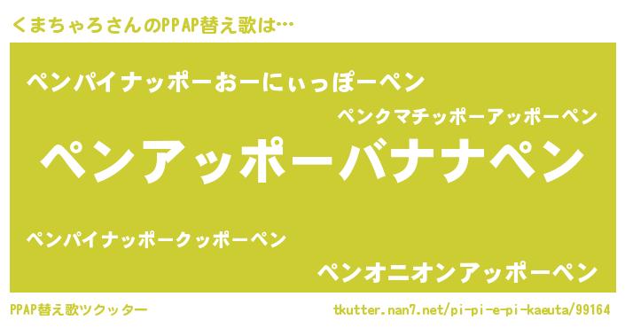 くまちゃろさんのPPAP替え歌は… 『ペンアッポーバナナペン』『ペンパイナッポーおーにぃっぽーペン』『ペンオニオンアッポーペン』 ツクッター #PPAP替え歌ツクッター http://tkutter.nan7.net/pi-pi-e-pi-kaeuta/99164/
