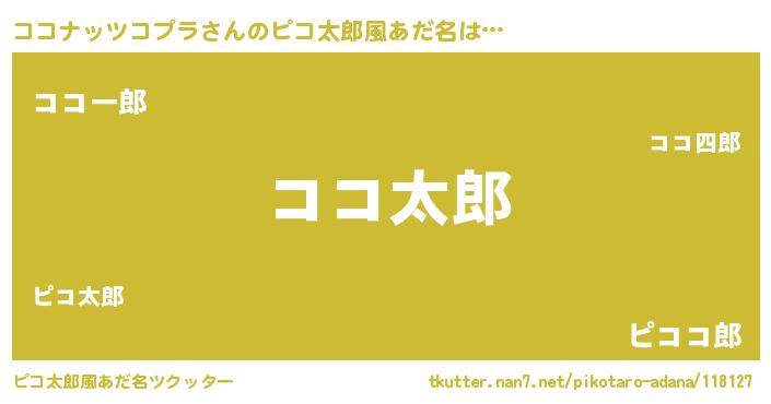 | 男性向けラノベタイトル風あだ名 | 『ココナッツコプラ~年齢イコール彼女いない歴の魔法使い~』 |
