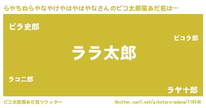 | 男性向けラノベタイトル風あだ名 | 『魔弾の王とらやちねらやなやけやはやはやな』 |