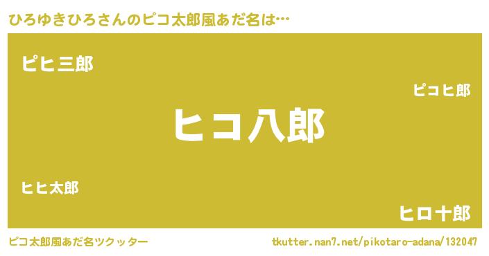 ひろゆきひろさんのピコ太郎風あだ名は… 『ヒコ八郎』『ピヒ三郎』『ヒロ十郎』 ツクッター #ピコ太郎風あだ名ツクッター http://tkutter.nan7.net/pikotaro-adana/132047/