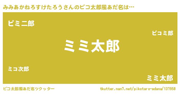 | 男性向けラノベタイトル風あだ名 | 『みみあかねろすけたろうの嫁は女の子じゃないと思った?』 |