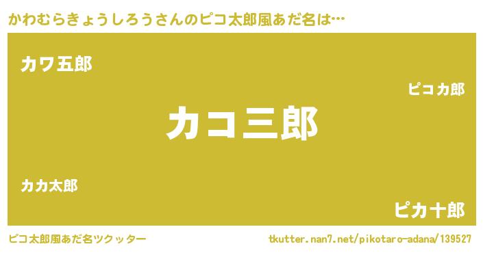 かわむらきょうしろうさんのピコ太郎風あだ名は… 『カコ三郎』『カワ五郎』『ピカ十郎』 ツクッター #ピコ太郎風あだ名ツクッター http://tkutter.nan7.net/pikotaro-adana/139527/