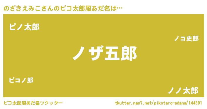 のざきえみこさんのピコ太郎風あだ名は… 『ノザ五郎』『ピノ太郎』『ノノ太郎』 ツクッター #ピコ太郎風あだ名ツクッター http://tkutter.nan7.net/pikotaro-adana/144301/