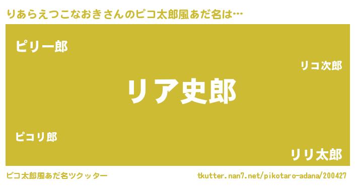 | 女子向けラノベタイトル風あだ名 | 『りあらえつこなおきの卵を拾いまして』 |
