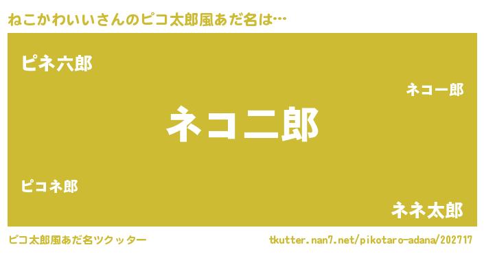 ねこかわいいさんのピコ太郎風あだ名は… 『ネコ二郎』『ピネ六郎』『ネネ太郎』 ツクッター #ピコ太郎風あだ名ツクッター http://tkutter.nan7.net/pikotaro-adana/202717/