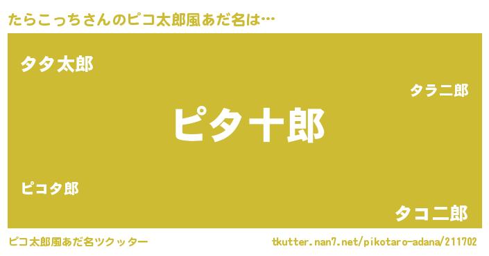 | 男性向けラノベタイトル風あだ名 | 『たらこっち~年齢イコール彼女いない歴の魔法使い~』 |