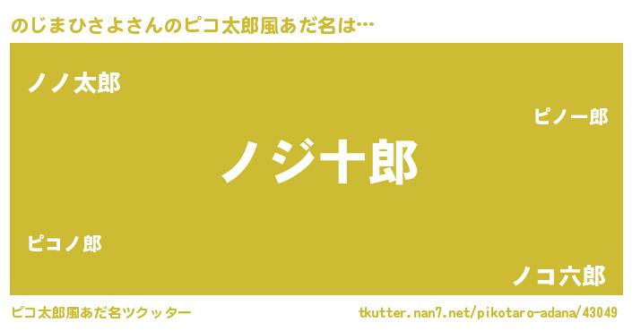 のじまひさよさんのピコ太郎風あだ名は… 『ノジ十郎』『ノノ太郎』『ノコ六郎』 ツクッター #ピコ太郎風あだ名ツクッター http://tkutter.nan7.net/pikotaro-adana/43049/