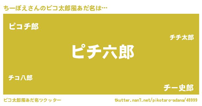 ちーぽえさんのピコ太郎風あだ名は… 『ピチ六郎』『ピコチ郎』『チー史郎』 ツクッター #ピコ太郎風あだ名ツクッター http://tkutter.nan7.net/pikotaro-adana/48999/