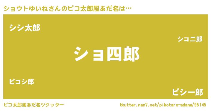 ショウトゆいねさんのピコ太郎風あだ名は… 『ショ四郎』『シシ太郎』『ピシ一郎』 ツクッター #ピコ太郎風あだ名ツクッター http://tkutter.nan7.net/pikotaro-adana/95145/