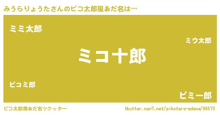みうらりょうたさんのピコ太郎風あだ名は… 『ミコ十郎』『ミミ太郎』『ピミ一郎』 ツクッター #ピコ太郎風あだ名ツクッター http://tkutter.nan7.net/pikotaro-adana/96573/