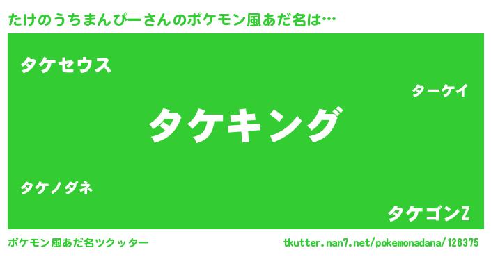 | 男性向けラノベタイトル風あだ名 | 『たけのうちまんぴー~年齢イコール彼女いない歴の魔法使い~』 |