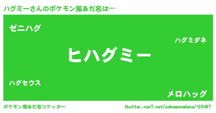 | 男性向けラノベタイトル風あだ名 | 『ハグミーの嫁は女の子じゃないと思った?』 |