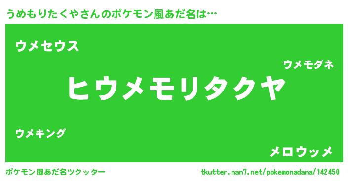 | 女子向けラノベタイトル風あだ名 | 『うめもりたくやの卵を拾いまして』 |