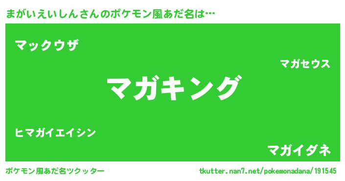 | 男性向けラノベタイトル風あだ名 | 『まがいえいしん~年齢イコール彼女いない歴の魔法使い~』 |