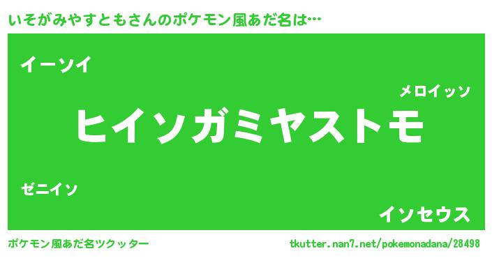 | 男性向けラノベタイトル風あだ名 | 『いそがみやすともの嫁は女の子じゃないと思った?』 |