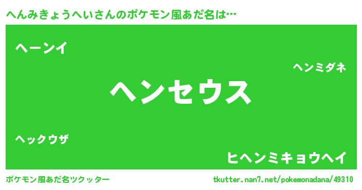 | 男性向けラノベタイトル風あだ名 | 『Re:へんみきょうへいから始める異世界生活』 |
