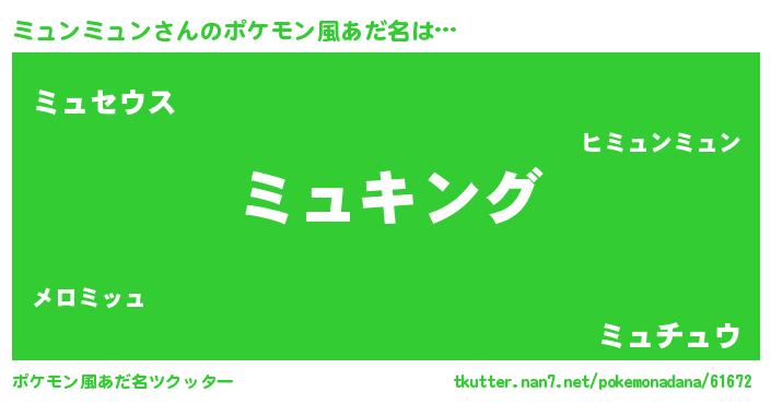 | 男性向けラノベタイトル風あだ名 | 『ミュンミュン~年齢イコール彼女いない歴の魔法使い~』 |