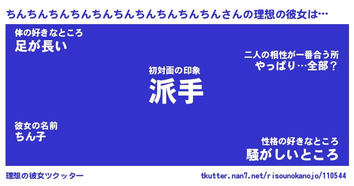| 女子向けラノベタイトル風あだ名 | 『(仮)ちんちんちんちんちんちんちんちんちんちんのやんごとなき事情』 |