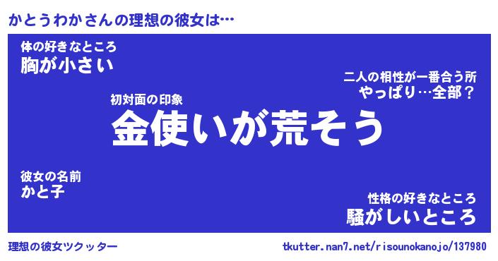 | ヘコむあだ名 | 『かとにー』『豆乳』『かとを』 |