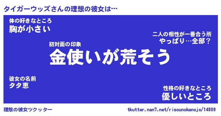| 女子向けラノベタイトル風あだ名 | 『誰かこのタイガーウッズを説明してください! ~契約から始まるウェディング~』 |