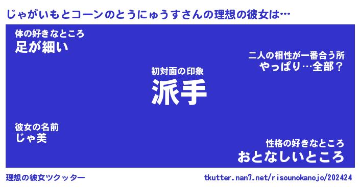 | 肩書あだ名 | 『じゃがいもとコーンのとうにゅうす店長』 |