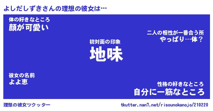 | 料理風あだ名 | 『ほっこり♪よしだしずきの味噌そぼろ煮』 |