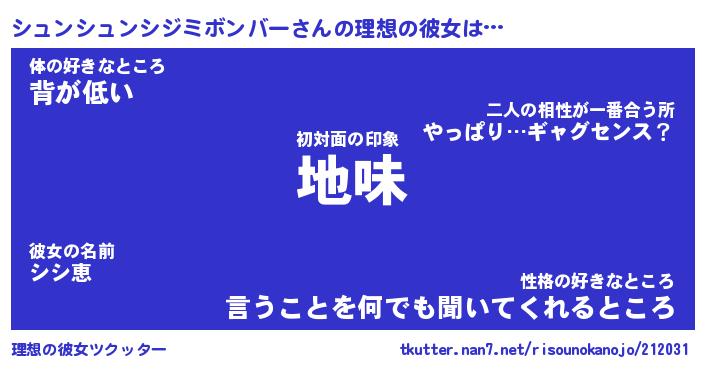 | 男性向けラノベタイトル風あだ名 | 『シュンシュンシジミボンバーの憂鬱』 |
