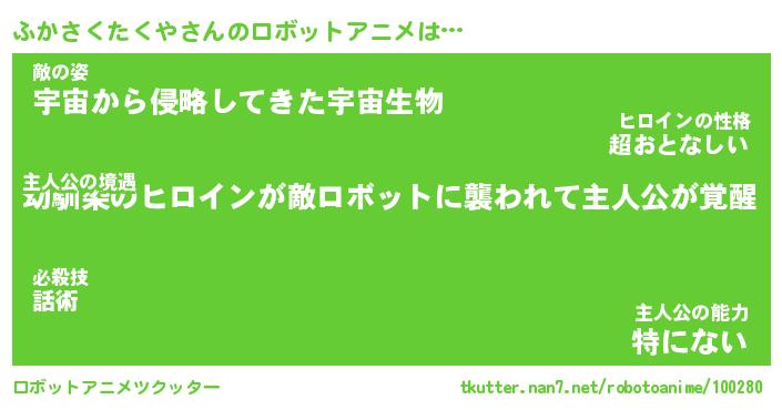 ふかさくたくやさんのロボットアニメは… 主人公の境遇『幼馴染のヒロインが敵ロボットに襲われて主人公が覚醒』敵の姿『宇宙から侵略してきた宇宙生物』主人公の能力『特にない』 ツクッター #ロボットアニメツクッター http://tkutter.nan7.net/robotoanime/100280/