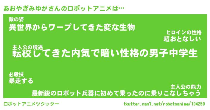 あおやぎみゆかさんのロボットアニメは… 主人公の境遇『転校してきた内気で暗い性格の男子中学生』敵の姿『異世界からワープしてきた変な生物』主人公の能力『最新鋭のロボット兵器に初めて乗ったのに乗りこなしちゃう』 ツクッター #ロボットアニメツクッター http://tkutter.nan7.net/robotoanime/104250/