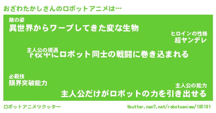 おざわたかしさんのロボットアニメは… 主人公の境遇『下校中にロボット同士の戦闘に巻き込まれる』敵の姿『異世界からワープしてきた変な生物』主人公の能力『主人公だけがロボットの力を引き出せる』 ツクッター #ロボットアニメツクッター http://tkutter.nan7.net/robotoanime/105101/
