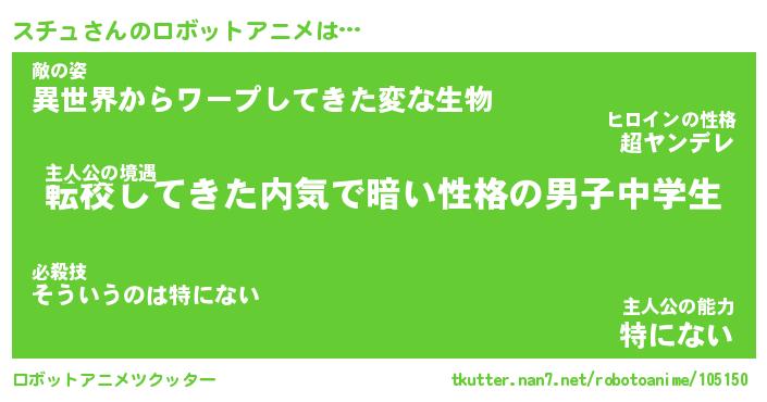 スチュさんのロボットアニメは… 主人公の境遇『転校してきた内気で暗い性格の男子中学生』敵の姿『異世界からワープしてきた変な生物』主人公の能力『特にない』 ツクッター #ロボットアニメツクッター http://tkutter.nan7.net/robotoanime/105150/