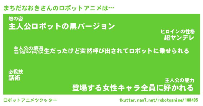 まちだなおきさんのロボットアニメは… 主人公の境遇『普通の高校生だったけど突然呼び出されてロボットに乗せられる』敵の姿『主人公ロボットの黒バージョン』主人公の能力『登場する女性キャラ全員に好かれる』 ツクッター #ロボットアニメツクッター http://tkutter.nan7.net/robotoanime/108495/