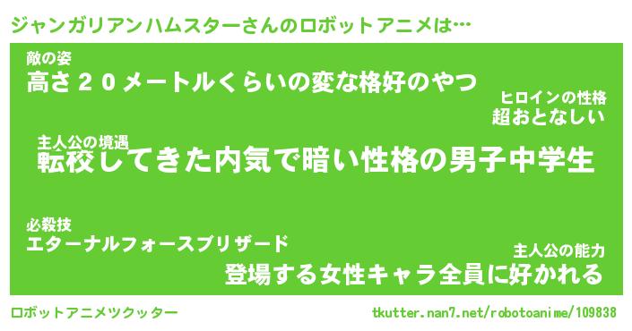 ジャンガリアンハムスターさんのロボットアニメは… 主人公の境遇『転校してきた内気で暗い性格の男子中学生』敵の姿『高さ20メートルくらいの変な格好のやつ』主人公の能力『登場する女性キャラ全員に好かれる』 ツクッター #ロボットアニメツクッター http://tkutter.nan7.net/robotoanime/109838/