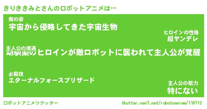 きりききみとさんのロボットアニメは… 主人公の境遇『幼馴染のヒロインが敵ロボットに襲われて主人公が覚醒』敵の姿『宇宙から侵略してきた宇宙生物』主人公の能力『特にない』 ツクッター #ロボットアニメツクッター http://tkutter.nan7.net/robotoanime/110712/