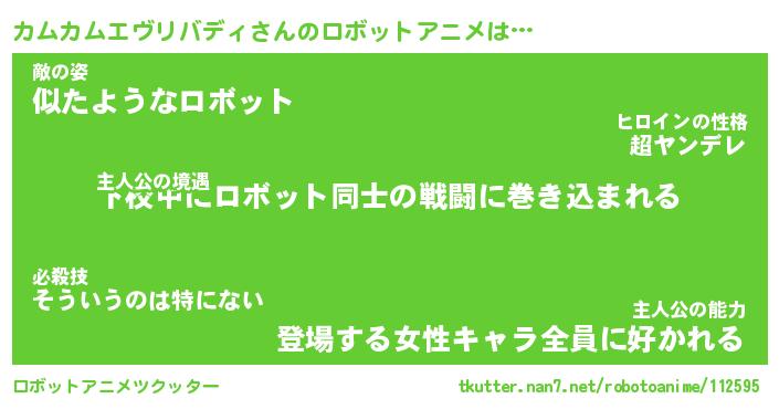 カムカムエヴリバディさんのロボットアニメは… 主人公の境遇『下校中にロボット同士の戦闘に巻き込まれる』敵の姿『似たようなロボット』主人公の能力『登場する女性キャラ全員に好かれる』 ツクッター #ロボットアニメツクッター http://tkutter.nan7.net/robotoanime/112595/