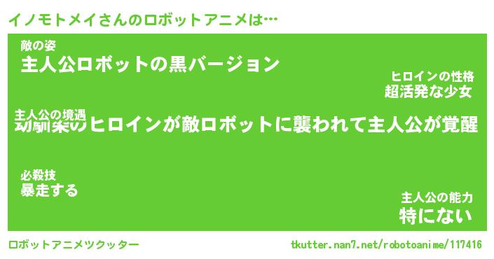 イノモトメイさんのロボットアニメは… 主人公の境遇『幼馴染のヒロインが敵ロボットに襲われて主人公が覚醒』敵の姿『主人公ロボットの黒バージョン』主人公の能力『特にない』 ツクッター #ロボットアニメツクッター http://tkutter.nan7.net/robotoanime/117416/