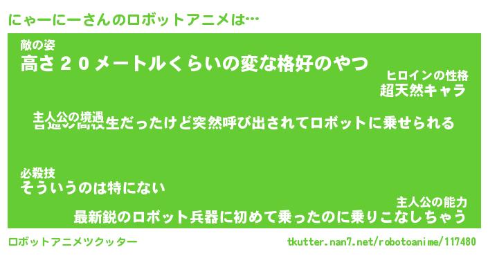 にゃーにーさんのロボットアニメは… 主人公の境遇『普通の高校生だったけど突然呼び出されてロボットに乗せられる』敵の姿『高さ20メートルくらいの変な格好のやつ』主人公の能力『最新鋭のロボット兵器に初めて乗ったのに乗りこなしちゃう』 ツクッター #ロボットアニメツクッター http://tkutter.nan7.net/robotoanime/117480/