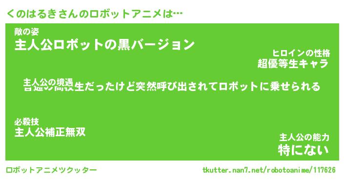 くのはるきさんのロボットアニメは… 主人公の境遇『普通の高校生だったけど突然呼び出されてロボットに乗せられる』敵の姿『主人公ロボットの黒バージョン』主人公の能力『特にない』 ツクッター #ロボットアニメツクッター http://tkutter.nan7.net/robotoanime/117626/