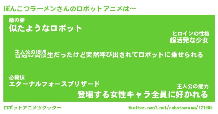 ぽんこつラーメンさんのロボットアニメは… 主人公の境遇『普通の高校生だったけど突然呼び出されてロボットに乗せられる』敵の姿『似たようなロボット』主人公の能力『登場する女性キャラ全員に好かれる』 ツクッター #ロボットアニメツクッター http://tkutter.nan7.net/robotoanime/121685/