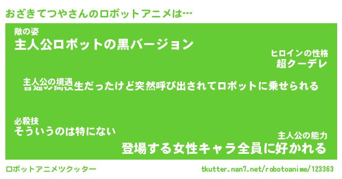 おざきてつやさんのロボットアニメは… 主人公の境遇『普通の高校生だったけど突然呼び出されてロボットに乗せられる』敵の姿『主人公ロボットの黒バージョン』主人公の能力『登場する女性キャラ全員に好かれる』 ツクッター #ロボットアニメツクッター http://tkutter.nan7.net/robotoanime/123363/