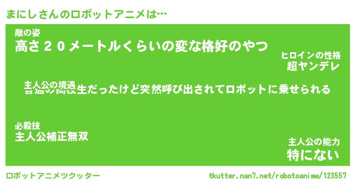 まにしさんのロボットアニメは… 主人公の境遇『普通の高校生だったけど突然呼び出されてロボットに乗せられる』敵の姿『高さ20メートルくらいの変な格好のやつ』主人公の能力『特にない』 ツクッター #ロボットアニメツクッター http://tkutter.nan7.net/robotoanime/123557/
